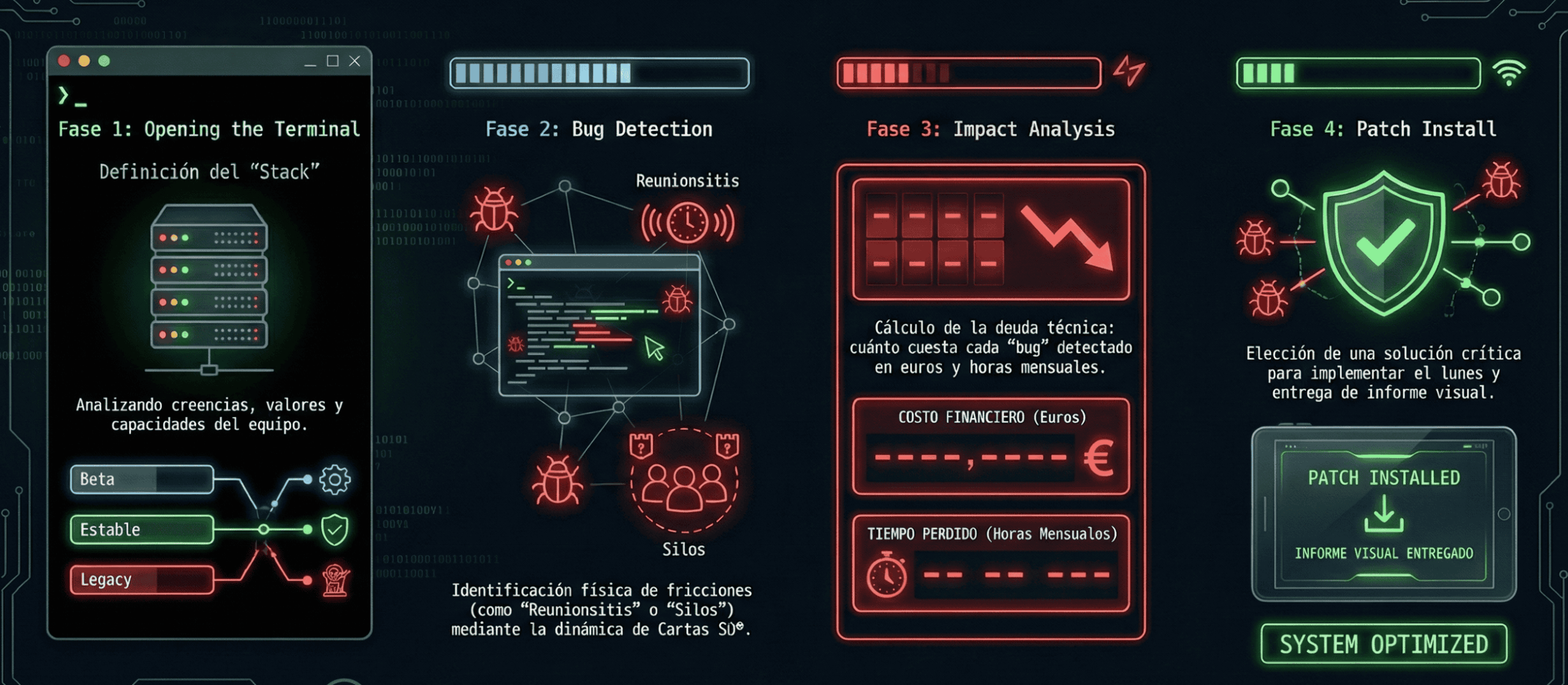 • Sesión diagnóstico 2h • Uso de cartas Sistemas Operativos® • Informe visual con foto de bugs detectados • Propuesta personalizada (taller / programa / sprint)