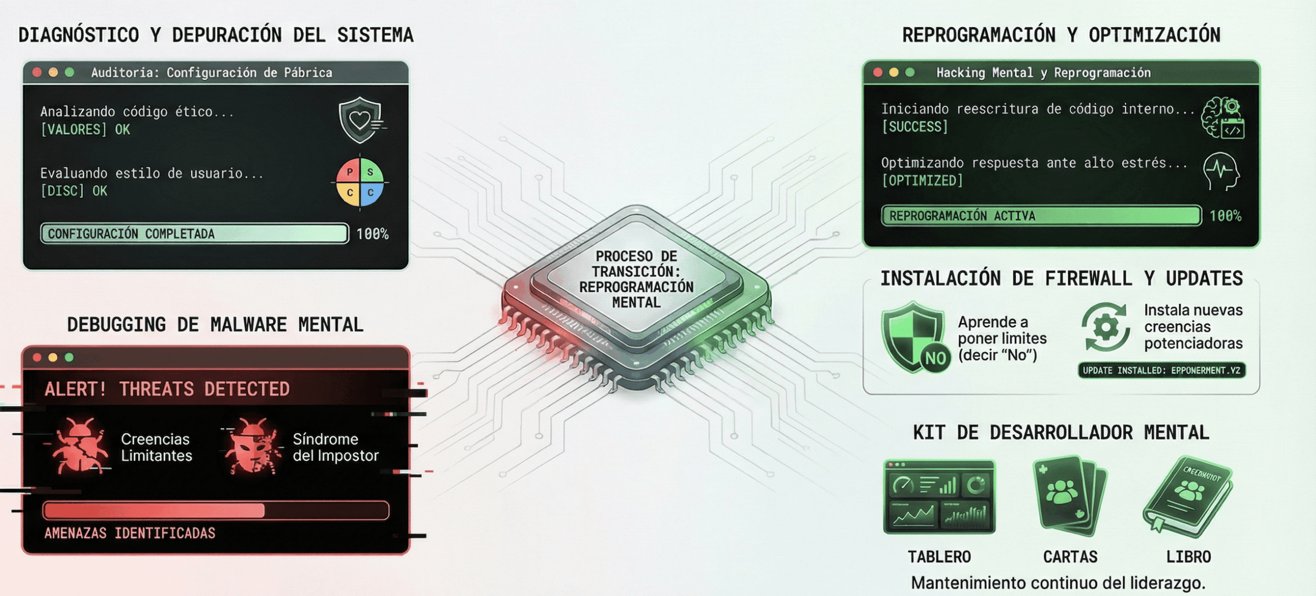 Este taller utiliza la analogía de la informática para guiar a los líderes en una "reprogramación" mental, desde una auditoria de valores hasta la instalación de nuevas creencias y herramientas de mantenimiento para optimizar el desempeño profesional.